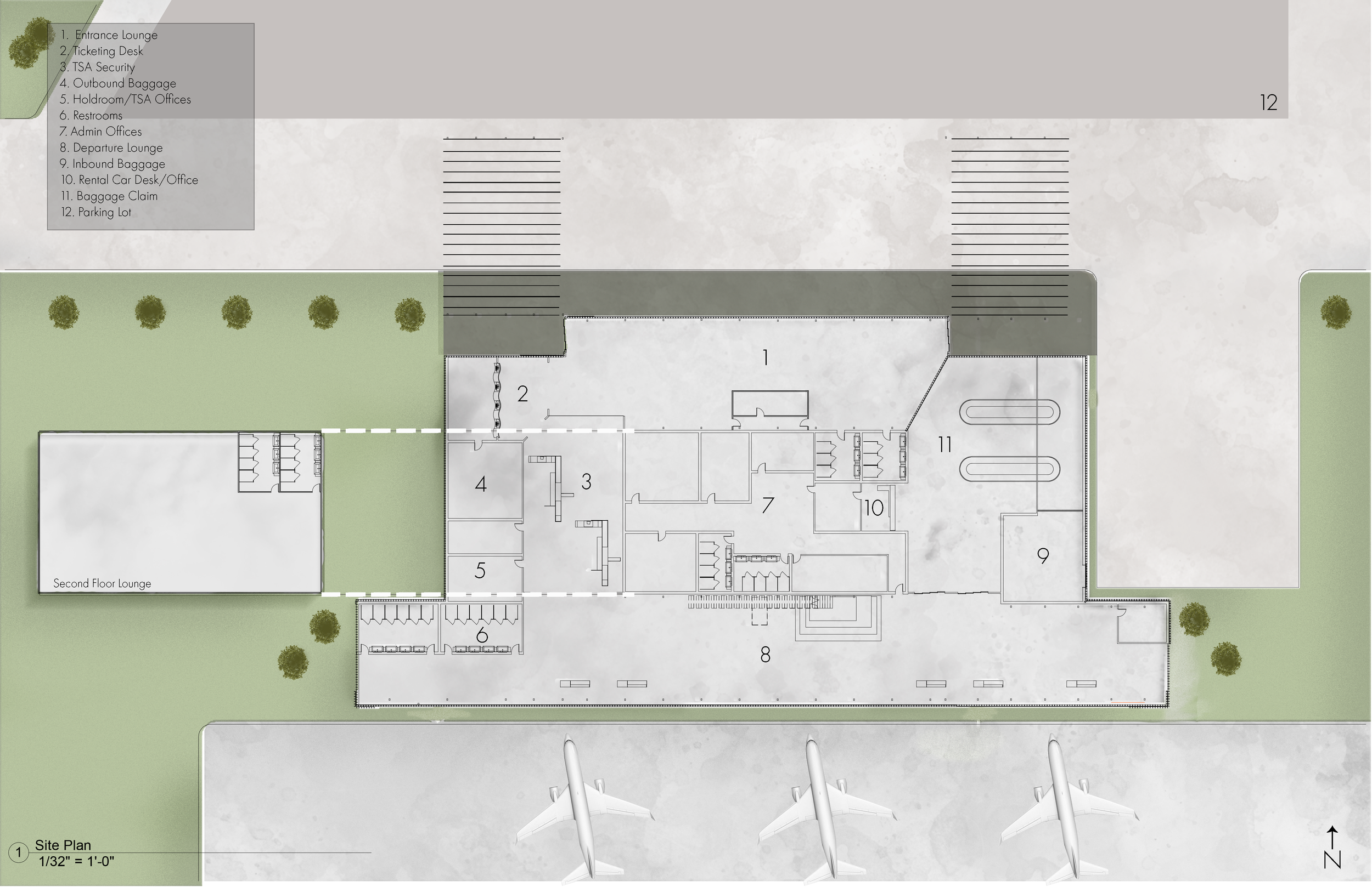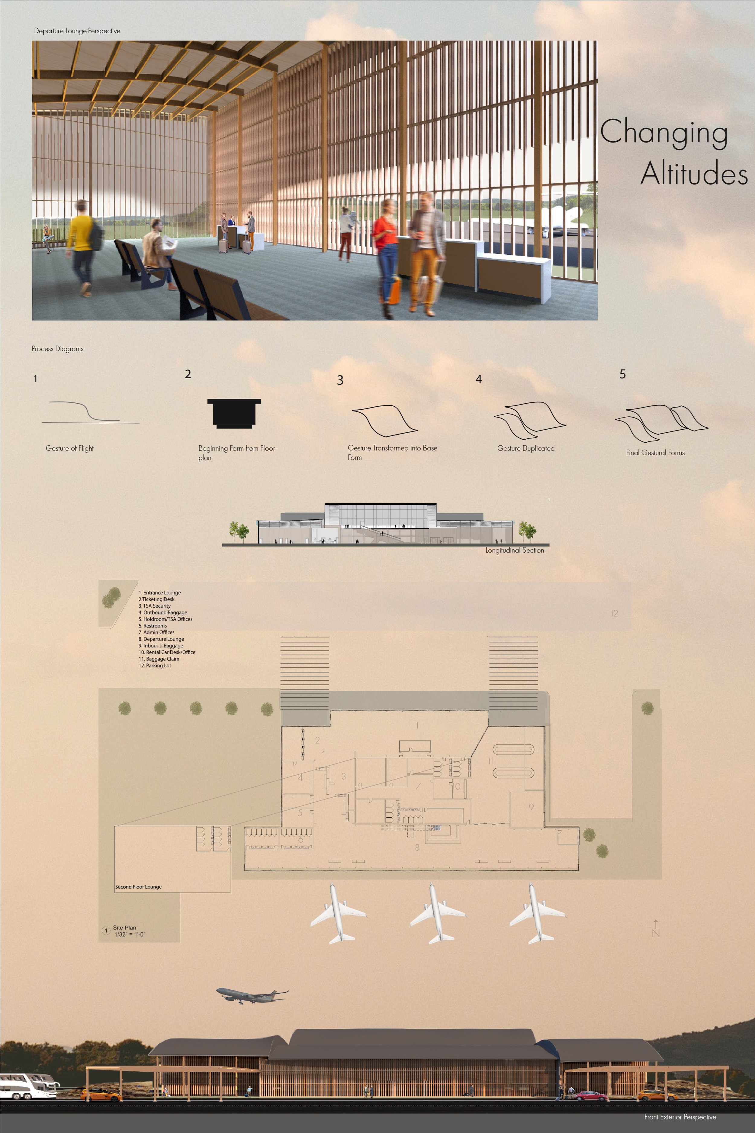 “The process of flight and changes one experiences throughout traveling is something often left undiscussed. During a typical flight, passengers undergo a change in altitude from takeoff to around 35,000 feet at cruising apex until returning to ground at landing. The change can be expressed in one motion adapted and repeated throughout the roof structure of this airport. This overall gesture being reflective of one’s journey and course traveled as they experience flight.”