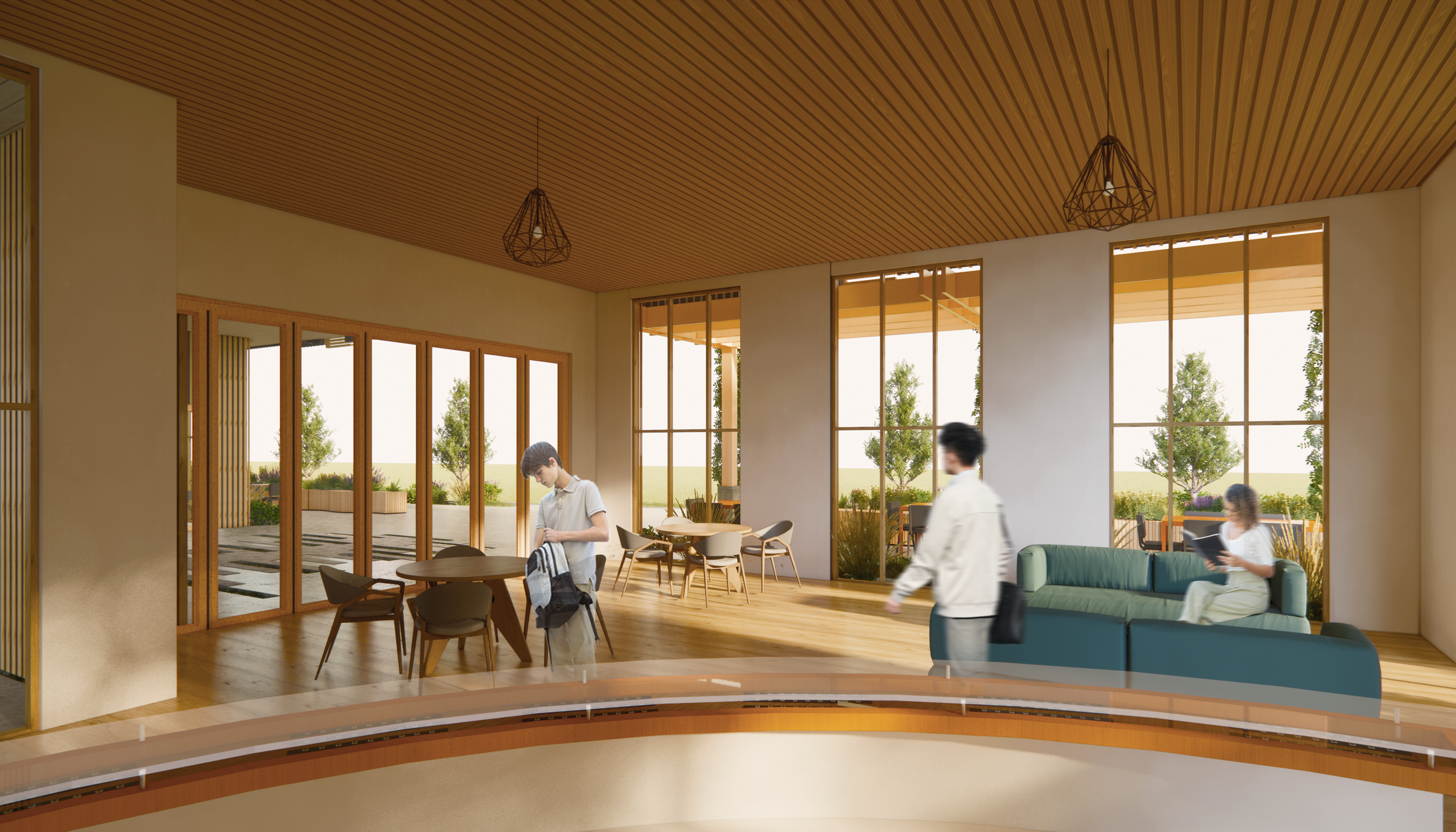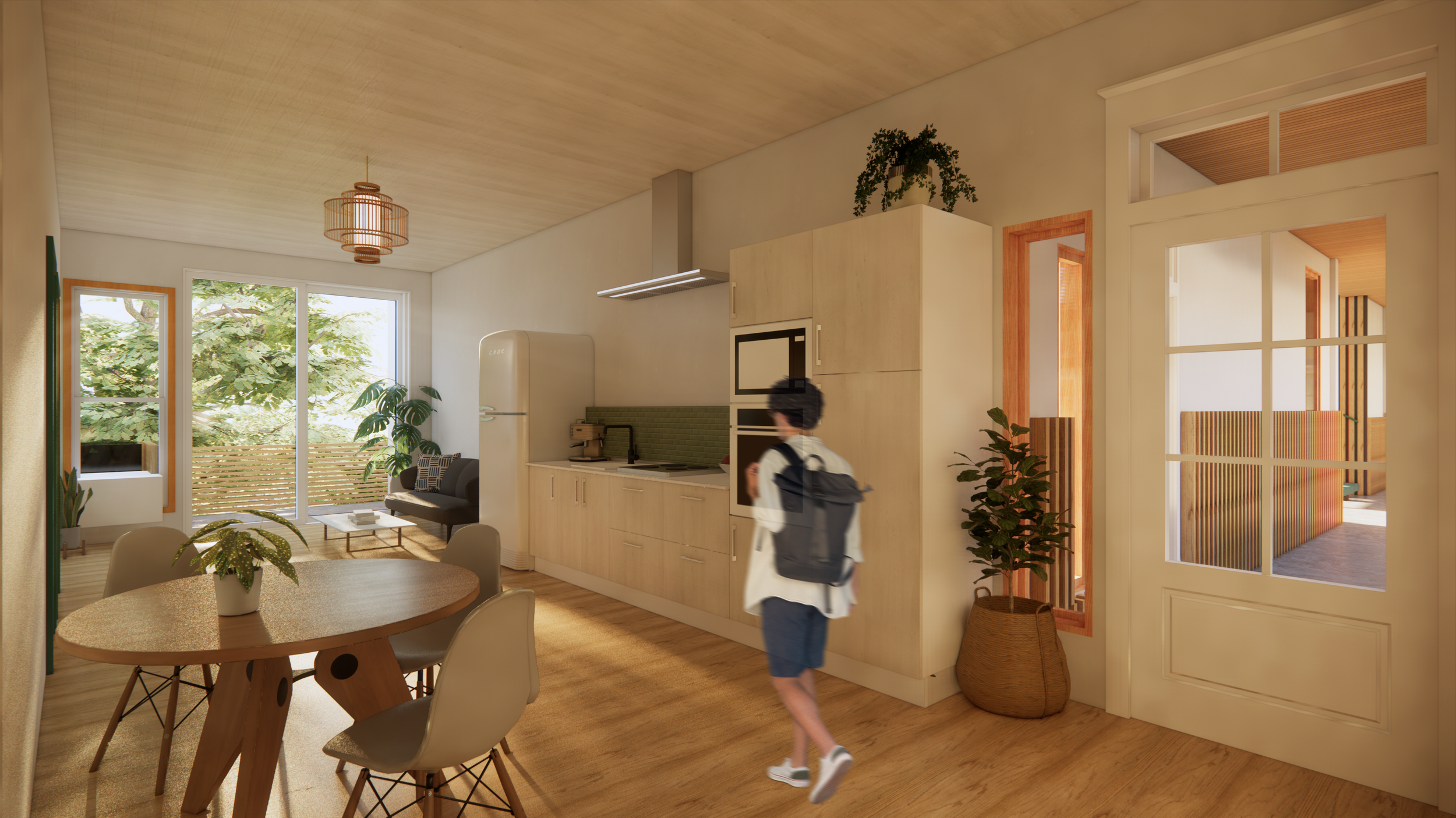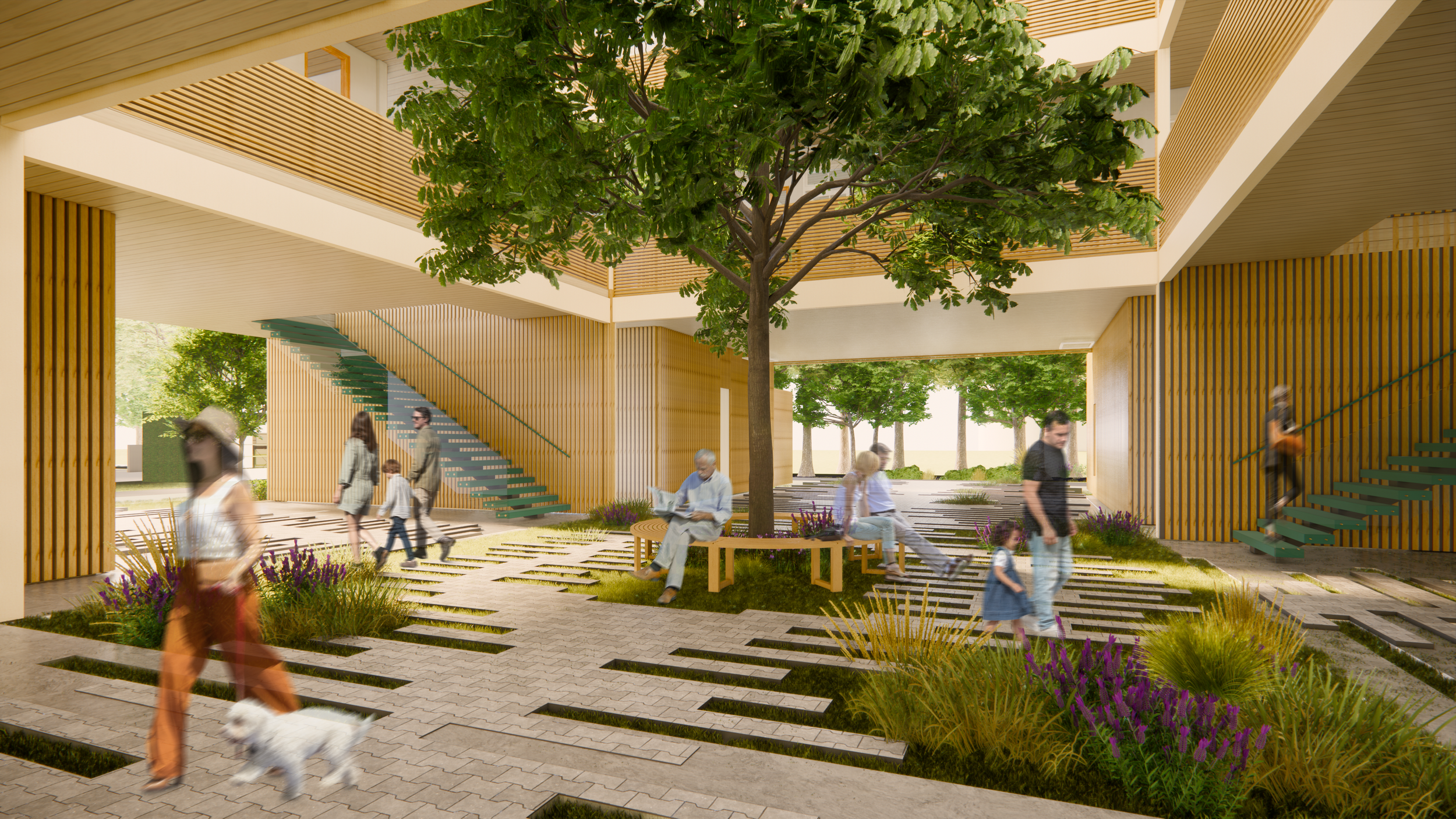 - Social housing focused program that includes a cafe, exhibition space, central courtyard, child play space, and meditative yoga room.