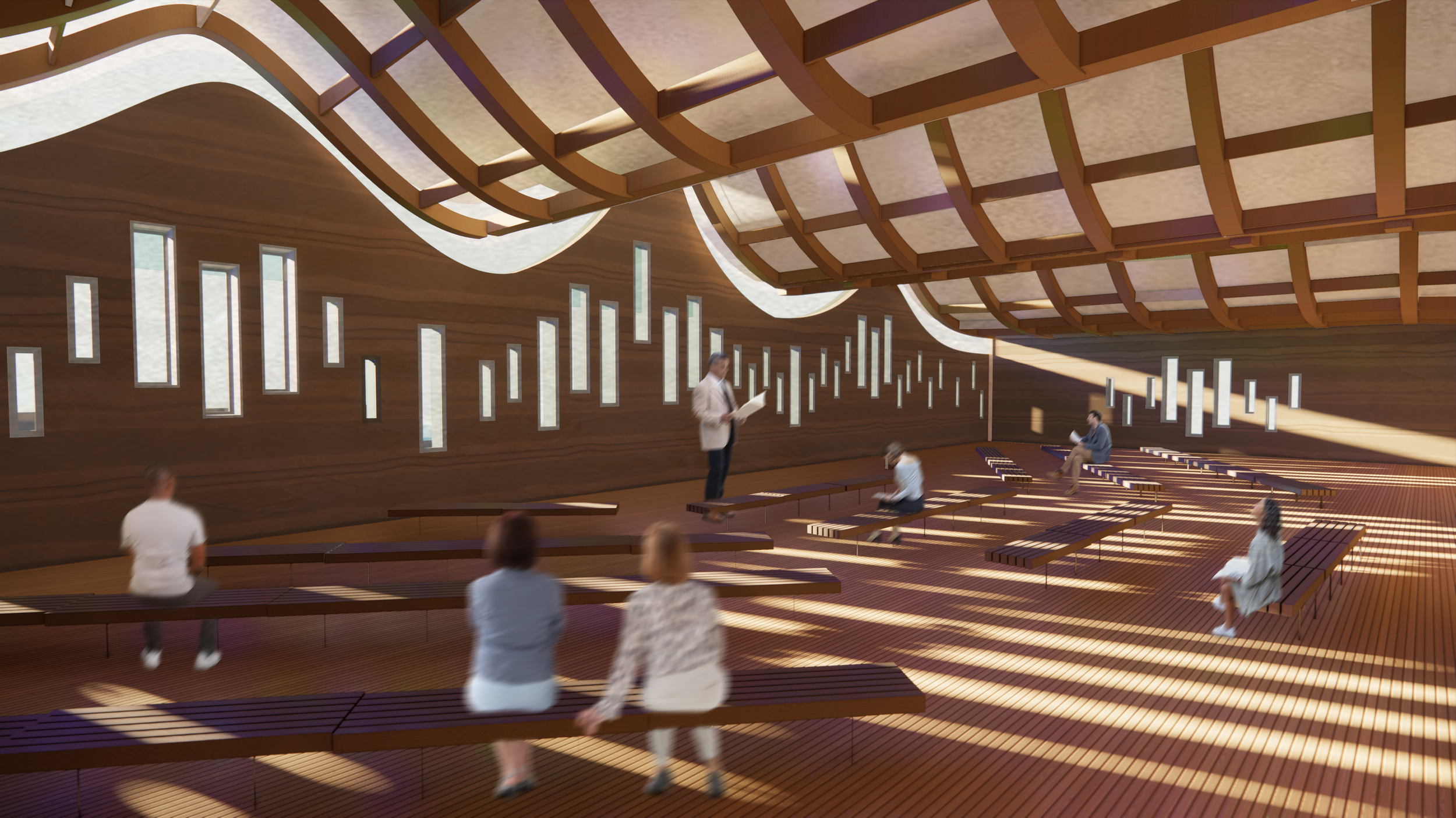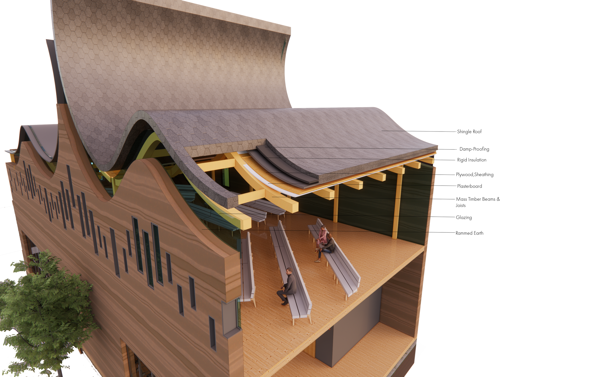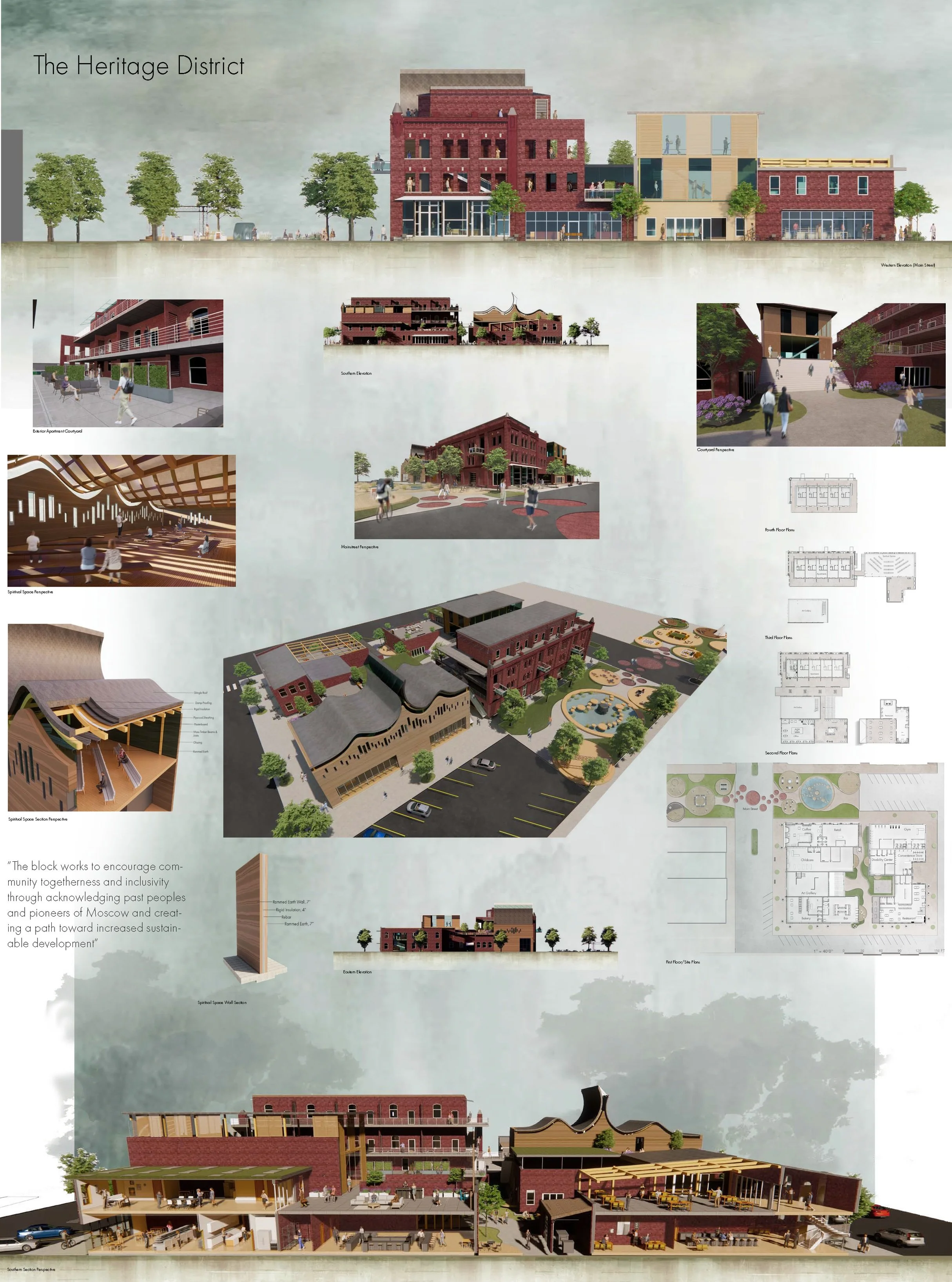 - Spiritual Space is designed to acknowledge past peoples of Moscow through the mass timber roof gesture. This gesture mimics the lands in which they traveled as well as the teepees in which they lived. The use of rammed earth through the first-floor gym (space in which one takes care of their body) that is carried up through the spiritual space (space where ones take care of their mind) is reflective of the overall connection between the body and the spirit.